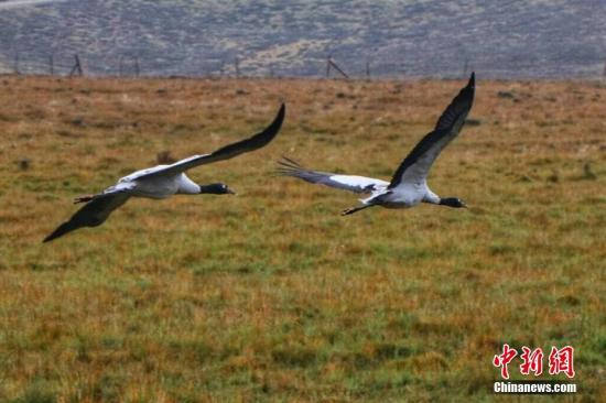 资料图:黑颈鹤在天空中展翅翱翔。 安建斌 摄