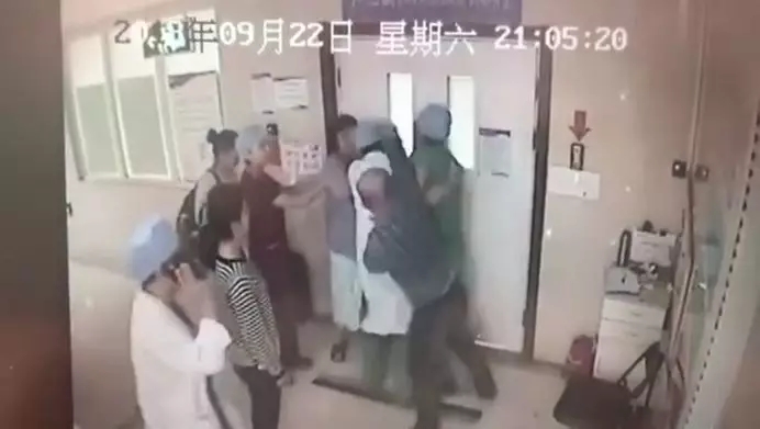 从视频画面中看到,患者家属按着赫医生头部殴打,被旁边几名医生拉开后,郑某宇和女儿郑某蕊再次上前冲其脸部挥拳,用脚将他踹倒在地。