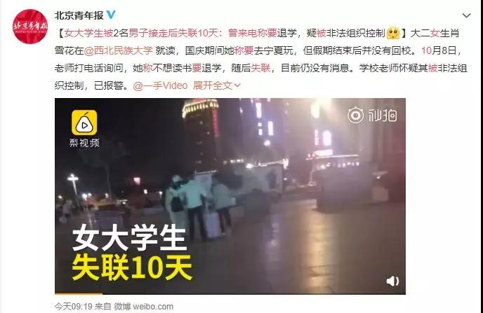 19日,有媒体发布消息称,大二女生肖雪花在西北民族大学就读,国庆期间她称要去宁夏玩,但假期结束后并没有回校。10月8日,老师打电话询问,她称不想读书要退学,随后失联,目前仍没有消息……
