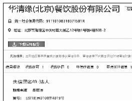 据某企业信息查询平台显示,华清缘(北京)餐饮股份有限公司于2015年2月15日被京海食药监处行政处罚,罚款5000元并没收违法所得24元。2017年12月28日,该企业因通过登记的住所或者经营场所无法联系,被北京市工商行政管理局海淀分局列为经营异常。