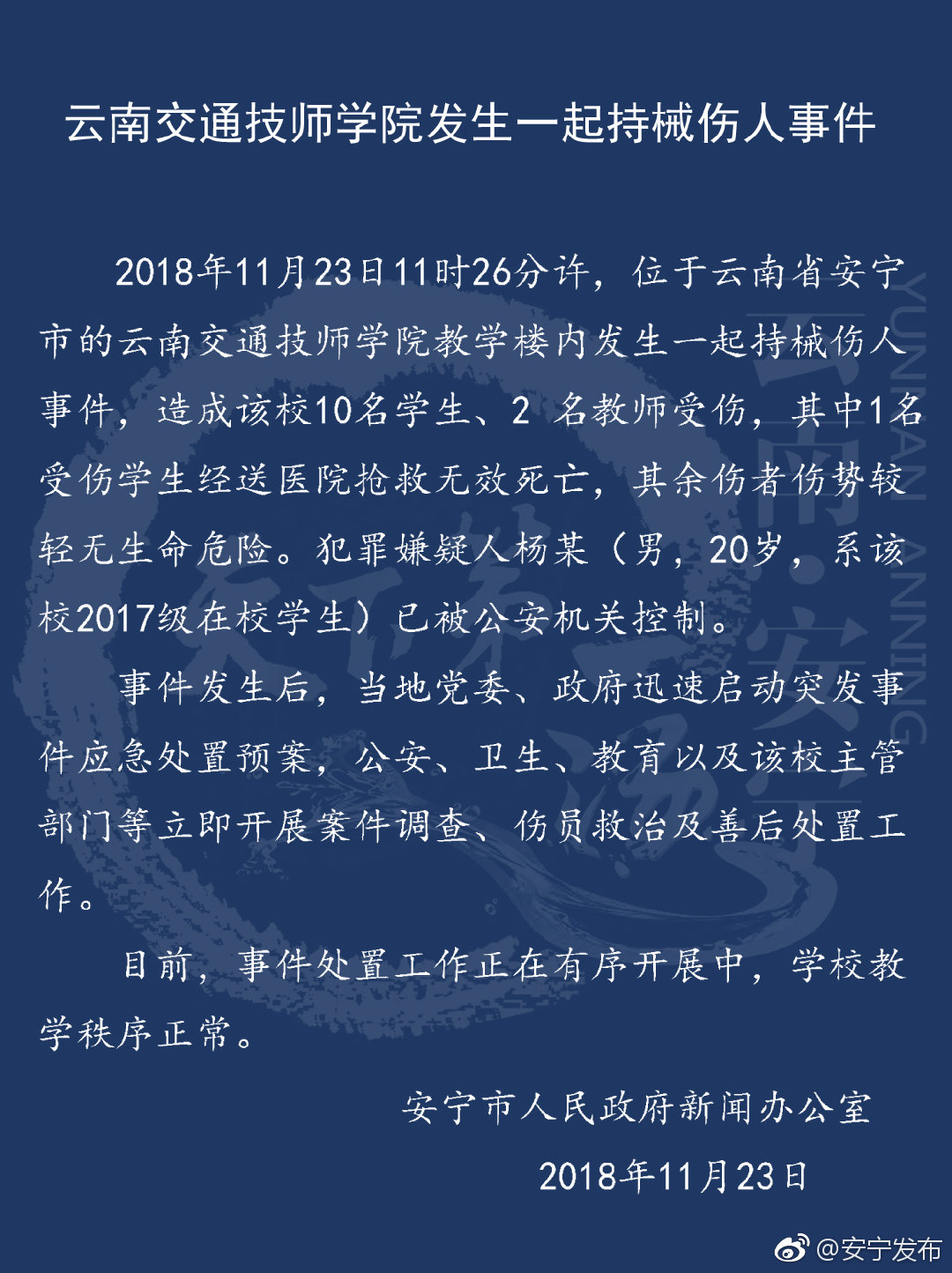 突发!云南一在校学生持械伤人,致师生11人受伤1人死亡