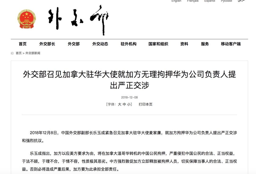 2018年12月8日,中国外交部副部长乐玉成紧急召见加拿大驻华大使麦家廉,就加方拘押华为公司负责人提出严正交涉和强烈抗议。