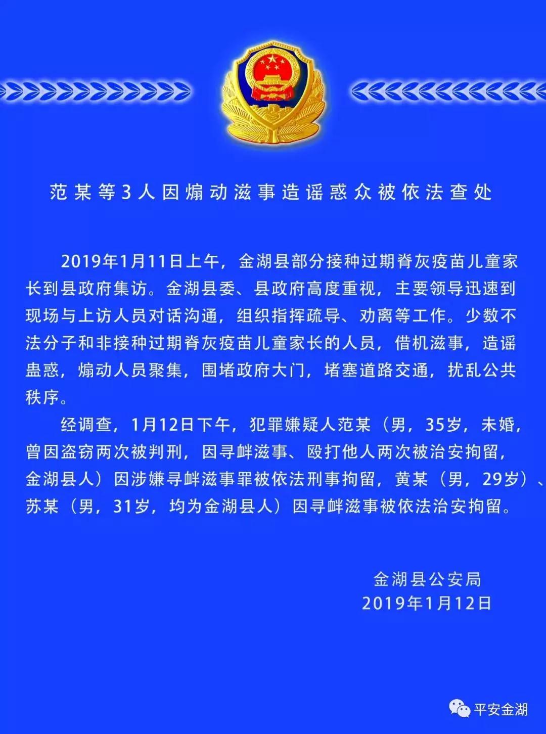 近日,江苏金湖145名儿童接种过期脊灰疫苗事件引发关注。据金湖县公安局通报,1月11日上午,金湖县部分接种过期脊灰疫苗儿童家长到县政府集访。少数不法分子和非接种过期脊灰疫苗儿童家长的人员,借机滋事,造谣蛊惑,煽动人员聚集,围堵政府大门,堵塞道路交通,扰乱公共秩序。