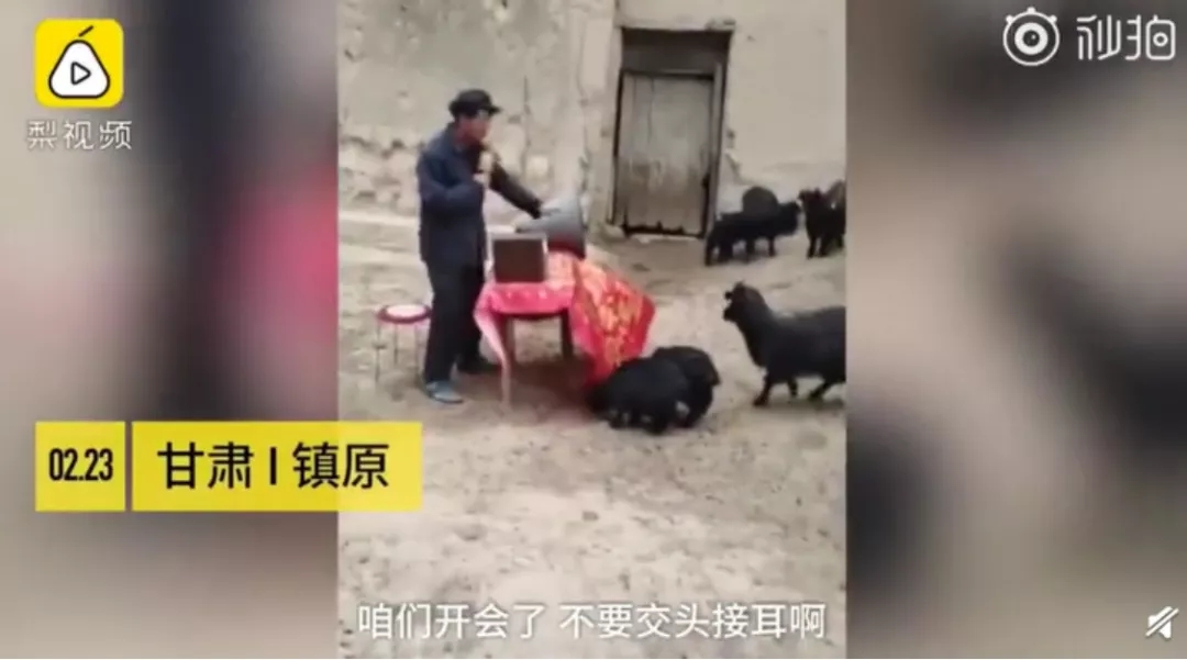 3、都给我听好了!大叔羊圈里给羊开会 23日,甘肃镇原,一位大叔在羊圈里开会:他端坐在桌子前,向羊保证玉米会供应充足,还吐槽一头羊生活作风有问题,“恋情太复杂”。大叔称,希望羊多生挣钱,视频是女儿拍的,希望能给大家带来欢乐。(@梨视频)