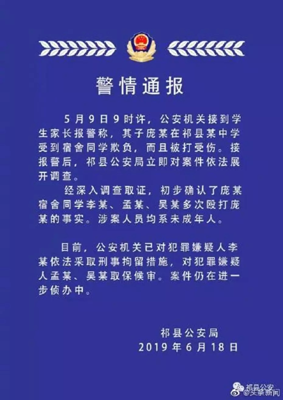 职校生遭同学霸凌211天患抑郁症 警方:已刑拘一人 近日,自称是山西祁县职业中学学生的网友发文称,在200多天的学习期间,他被李某某等人用燃着的烟头烫手、用水从头浇湿;床褥被泼水、床单被烟头烫坏;李某某等人强迫他整理所有人宿舍内务,义务叫餐等,目前,他已诊断患有中度抑郁与焦虑。祁县公安18日发布通报称,公安机关已对犯罪嫌疑人李某依法采取刑事拘留措施,对犯罪嫌疑人孟某、吴某取保候审。(@正义网)