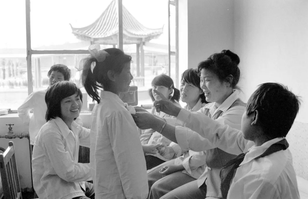 生活在唐山市育红学校的孤儿享受着大家庭的温暖。这是老师王子君星期日和孩子们在一起。新华社记者赵连升摄 (1986年7月5日发)