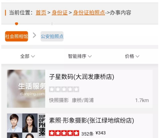 在公众号里查询的“居民身份证人像信息社会化采集点”信息,公众号将自动跳转大众点评网,由大众点评网提供“居民身份证人像信息社会化采集点”的地址、距离、服务评价等信息,方便群众就近、从优选择。