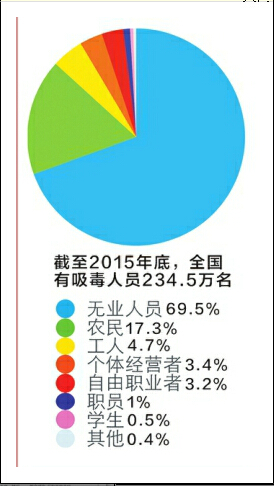 报告还指出,我国吸毒人群呈现多元化特点。在明确登记职业信息的吸毒人员中,无业人员占69.5%、农民占17.3%、工人占4.7%、个体经营者占3.4%、自由职业者占3.2%、职员占1%、学生占0.5%,其他(包括专业技术人员、企业管理人员以及公职人员、演艺界明星等)占0.4%。