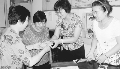 西安市未央区辛家庙街道新广路社区网格员赵彩勤(右二)帮助社区老人办理养老补贴。辛朋 摄