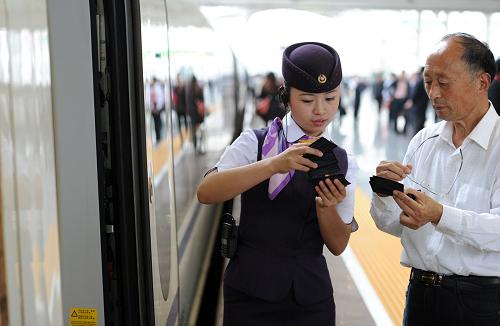 10月16日,服务员在合肥火车站为即将登上合肥至北京南G262次列车的旅客服务。新华社记者 刘军喜 摄