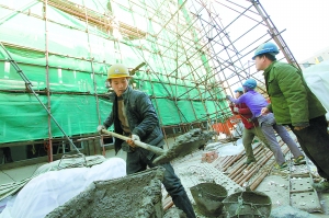 在东城区上龙西里抗震加固节能改造综合治理工程29号楼和30号楼施工现场,北京建工集团三建的工人师傅正在紧张施工。记者 方非摄