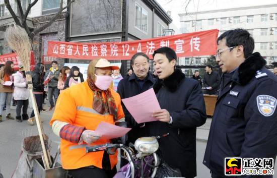 12月4日上午,山西省检察院党组成员、反贪局局长胡克勤带领省院各主要业务部门30多名干警,走上街头参加12.4全国法制宣传日活动。检察官通过大型宣传展板、散发宣传资料、法律咨询服务、现场受理举报等形式,向群众进行法制宣传和法律服务。山西大学商务学院法律系52名大学生与检察官一起参加了法制宣传日活动。当天上午,共发放宣传材料费1400余份,解答群众法律疑难问题30余件,受到群众欢迎。(记者郭超美 通讯员骆风林)