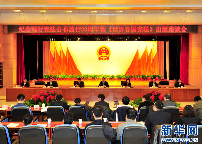 为纪念我国现行宪法颁布实施30周年,集联合国193个成员国的宪法文本译成约1280万字的中文文本集《世界各国宪法》一书于11月出版发行。2012年12月7日,纪念现行宪法公布施行30周年暨《世界各国宪法》出版座谈会在京举行。(卢俊宇摄)