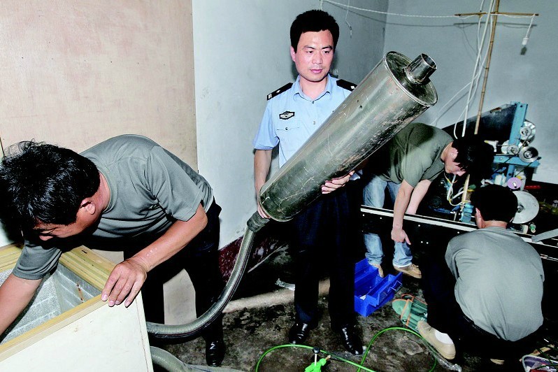 图为执法人员正在拆卸制假机器。 朱武涛 摄