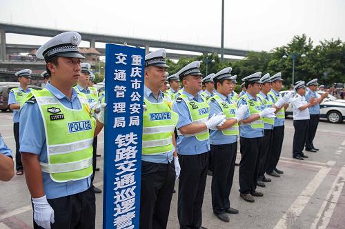 7月18日,重庆市公安局交通管理局铁路交通巡逻警察支队的队员们在授牌仪式现场。当日,重庆市公安局交通管理局铁路交通巡逻警察支队在重庆火车站正式挂牌运行。这支专门的铁路交巡警队伍将负责重庆市境内归属成都铁路公安局管辖范围内允许社会机动车辆通行的重庆(菜园坝)火车站、重庆北(龙头寺)站、重庆西站以及其他辖区内的铁路车站(场)和铁路单位内部等近20个铁路专属区域内的交通管理、巡逻防控工作。铁路交通巡逻警察支队的成立对在铁路站(场)人流密集区域明晰道路管辖权、规范执法、维护交通秩序、保障群众出行安全等方面具有重要意义。新华社记者 刘潺 摄