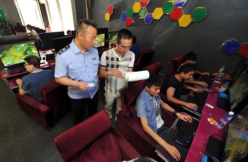 7月29日,宁夏回族自治区西吉县综合执法人员在一家网吧内检查。暑假期间,宁夏回族自治区各地文化执法部门纷纷对辖区内的网吧进行高强度检查整治,防止未成年人进入网吧或在网吧逗留,净化学生们的暑期生活。新华社记者 彭昭之 摄