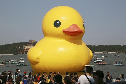 10月7日,游客在北京颐和园观看大黄鸭。新华社发(王振 摄)