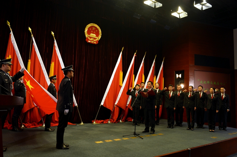 根据党的群众路线教育实践活动的安排,9月27日下午,上海海事法院举行“我把群众放在心上”——党的群众路线教育实践活动报告会。海事法院院长应新龙为在政法岗位上工作30年的法官颁发荣誉天平奖章及证书,为初任法官颁发任命书。4名初任法官、10名新进人员在国旗下庄严宣誓。离退休老同志代表及干警家属应邀出席报告会并发言。