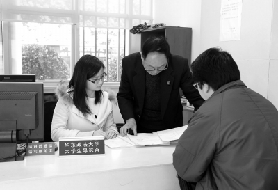 图为在松江法院法官指导下,华东政法大学大学生对当事人进行导诉服务。陆珺怡 摄