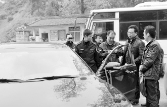 在古田县凤梅亭陵园停车场,县纪委监察和交警工作人员在对车辆进行核查