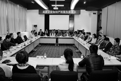 图为福州中院在福州软件园召开高新企业知识产权服务座谈会。