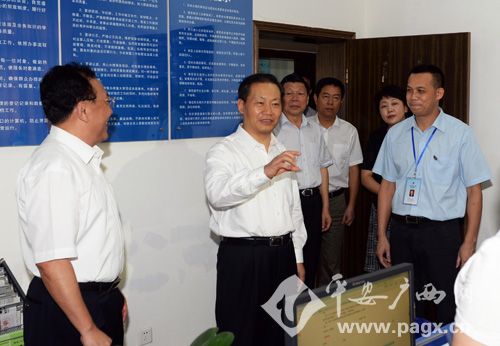 自治区党委书记、自治区人大常委会主任彭清华(左二)以及自治区党委常委、政法委书记温卡华(左三),自治区党委常委、秘书长范晓莉(右二),到南宁市青秀区新竹街道司法所调研。广西日报记者 黄克 摄
