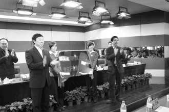 图为2012年3月北京市朝阳区人民政府依法行政教育培训中心成立时,时任北京市政府法制办党组书记周继东(右)和时任朝阳区区长程连元(左,现任朝阳区区委书记)为中心揭牌。 (资料图片)