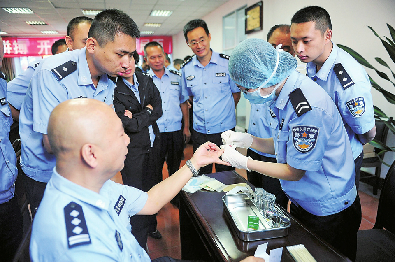 图为西昌铁路公安处的一名民警在练习采集生物检材。 (王晓丹 摄)