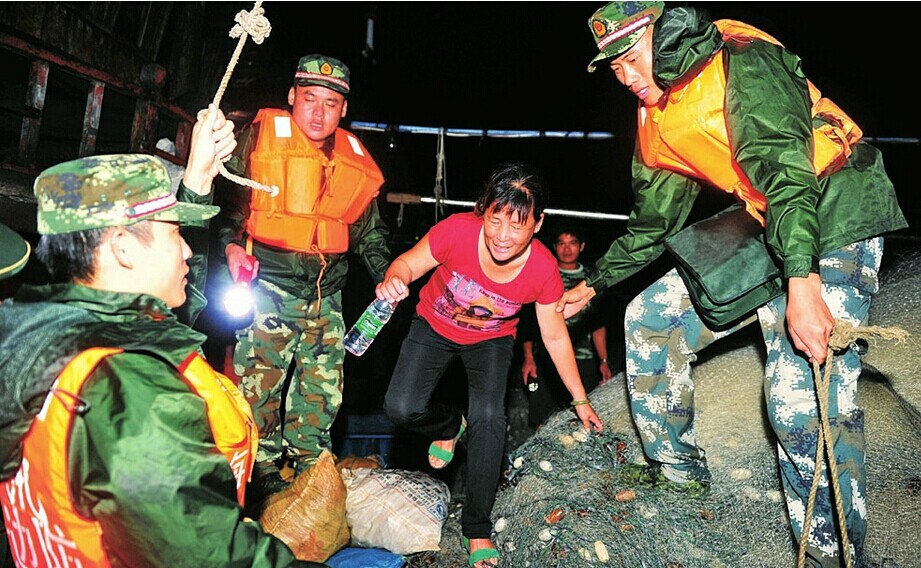 图为9月16日凌晨1时,海南公安边防总队文昌支队官兵将一名被困渔船上的妇女成功转移上岸。 朱晨鹏 摄