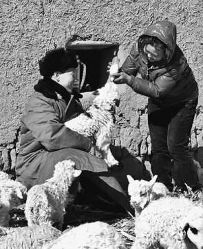 宝音德力格尔(左一)帮牧民给羔羊喂奶。记者 吴勇摄