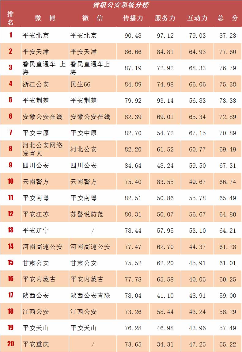 人民网舆情监测室发布全国政法系统“双微”排行榜,榜单通过对新浪微博和微信两大平台中25000余个政法系统机构开设的微博、微信账号进行数据统计和分析,从传播力、服务力和互动力三个维度评估每个账号的运营情况,本榜单统计周期为6月1日至22日。