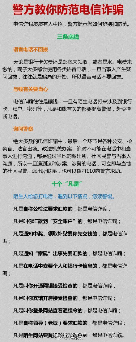#防范电信诈骗# 电信诈骗屡屡有人中招,警方教你防范小妙招:守住“三条底线”——语音电话不回拨、与钱有关要当心、询问警察,同时牢记“十个凡是”。