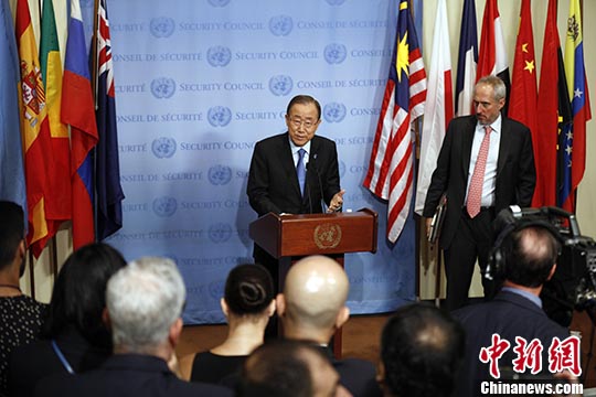 当地时间9月9日,联合国秘书长潘基文在纽约联合国总部就朝鲜核试验一事会见媒体记者并发表讲话,他以最强烈言辞谴责朝鲜9日进行的核试验,称朝方这一令人不可接受的行为危害了地区和平与安全。 中新社记者 廖攀 摄