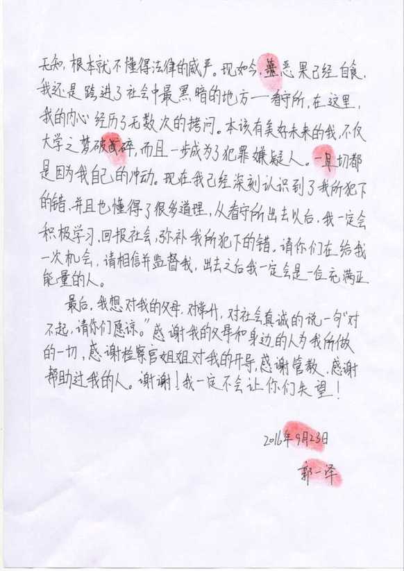 案件移送审查起诉后,承办人对案件进行了审查,认为在审查起诉阶段,郭某某经电话传唤后主动到案,如实供述了犯罪事实,并于9月23日亲笔书写悔过书,认罪、悔罪态度好;其无违法犯罪前科,系初犯、偶犯;受害者常升已被录取,对其表示谅解,请求司法机关对其从轻处罚,并出具书面谅解书。同时,承办人到学校进行调查,老师称其在学校表现良好,其老师、同学等通过辩护人提交多份请求书请求对其从轻处罚。