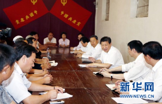 2013年7月11日至12日,中共中央总书记、国家主席、中央军委主席习近平在河北省调研指导党的群众路线教育实践活动。这是习近平在平山县西柏坡九月会议旧址同县乡村干部、老党员和群众代表座谈。新华社记者 鞠鹏 摄