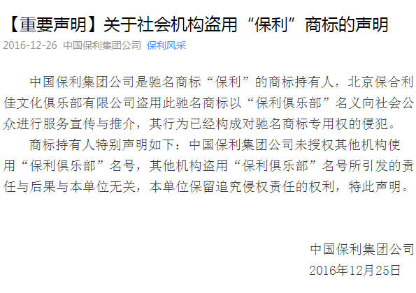 人民网北京12月26日电 今日凌晨,针对北京东直门南大街的保利俱乐部因涉及卖淫嫖娼违法犯罪活动被查处一事,保利集团微信公号发布声明称,中国保利集团公司是驰名商标“保利”的商标持有人,北京保合利佳文化俱乐部有限公司盗用此驰名商标以“保利俱乐部”名义向社会公众进行服务宣传与推介,其行为已经构成对驰名商标专用权的侵犯。
