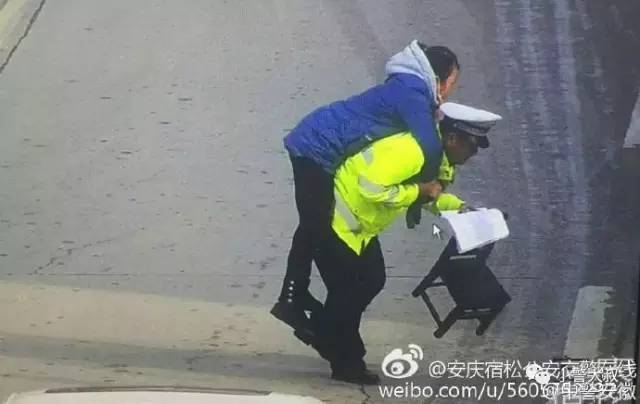 12月27日安庆【大姐,我来背你】上午10时许,宿松县城一辆电动车与小轿车发生碰撞,电动车上的大姐坐在地上无法站起来。赶到现场的安庆宿松公安交警在线事故处理民警连忙将其背起,并找来把椅子让她先坐下,等待120。