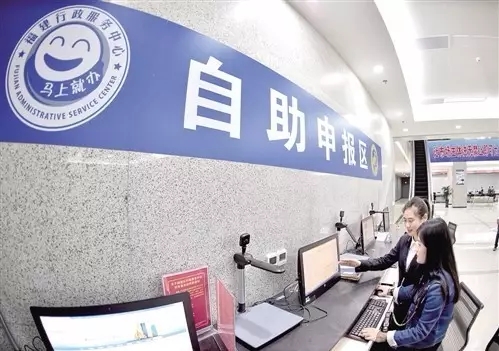 ↑4月6日,在福建自贸区平潭片区综合服务大厅,工作人员(后)在引导企业人员使用自助系统办理业务。