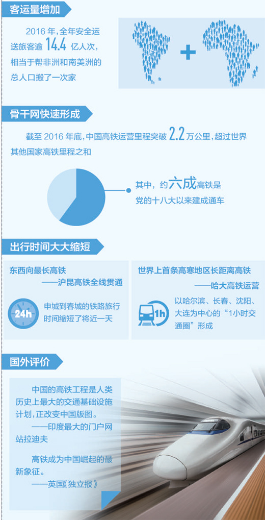 高铁客运量的增加,有赖于高铁骨干网的快速形成。十八大以来,中国高铁进入了大规模投入运营的阶段。截至2016年底,中国高铁运营里程突破2.2万公里,超过世界其他国家高铁里程之和,其中约六成高铁是党的十八大以来建成通车的,特别是中西部高铁从无到有,实现了中国高铁由“线”到“网”的飞跃,让中西部与东部之间的出行时间大幅缩短。