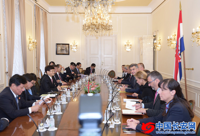 9月12日,克罗地亚总理普连科维奇在萨格勒布会见到访的习近平主席特使、中共中央政治局委员、中央政法委书记孟建柱。夏永军 摄