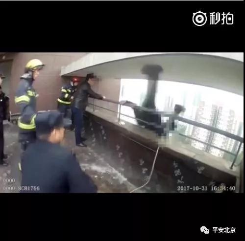 一秒的时间,民警纵身一跃将轻生男子死死抱住。