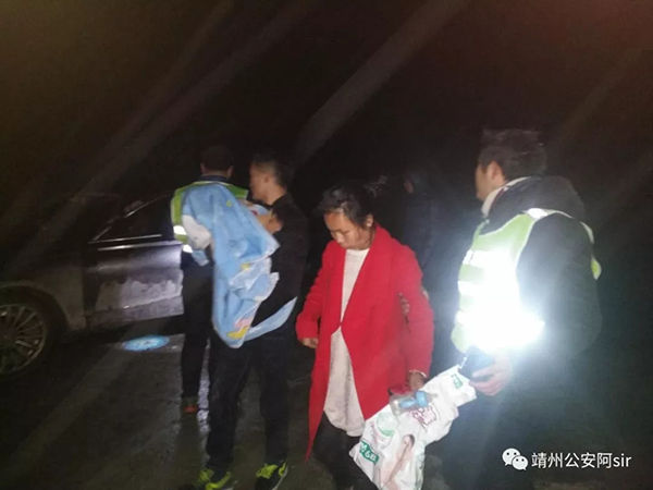 由于道路冰冻,警车无法驶入,靖州公安大堡子派出所教导员唐文广和工作人员只能打着手电筒,小心翼翼走了10里山路用了2个多小时才找到求助人一家。赶到现场,只见一台小车微微倾斜在冰冻路面,一名驾驶员、两位老人和一名妇女焦急地在车边等待,这名妇女手上还抱着一个嗷嗷待哺、不停啼哭的婴儿,他们在寒风中瑟瑟发抖。