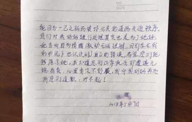 5月17日一早,孙某再次来到了母亲被查的海陵路奔牛转盘路口,把一封满含歉意的道歉信交到了执勤交警王继胜手中,"对不起,昨天我妈妈态度不好,今天我来代她向您道歉。" 说着把写好的道歉信交到了王继胜手中。