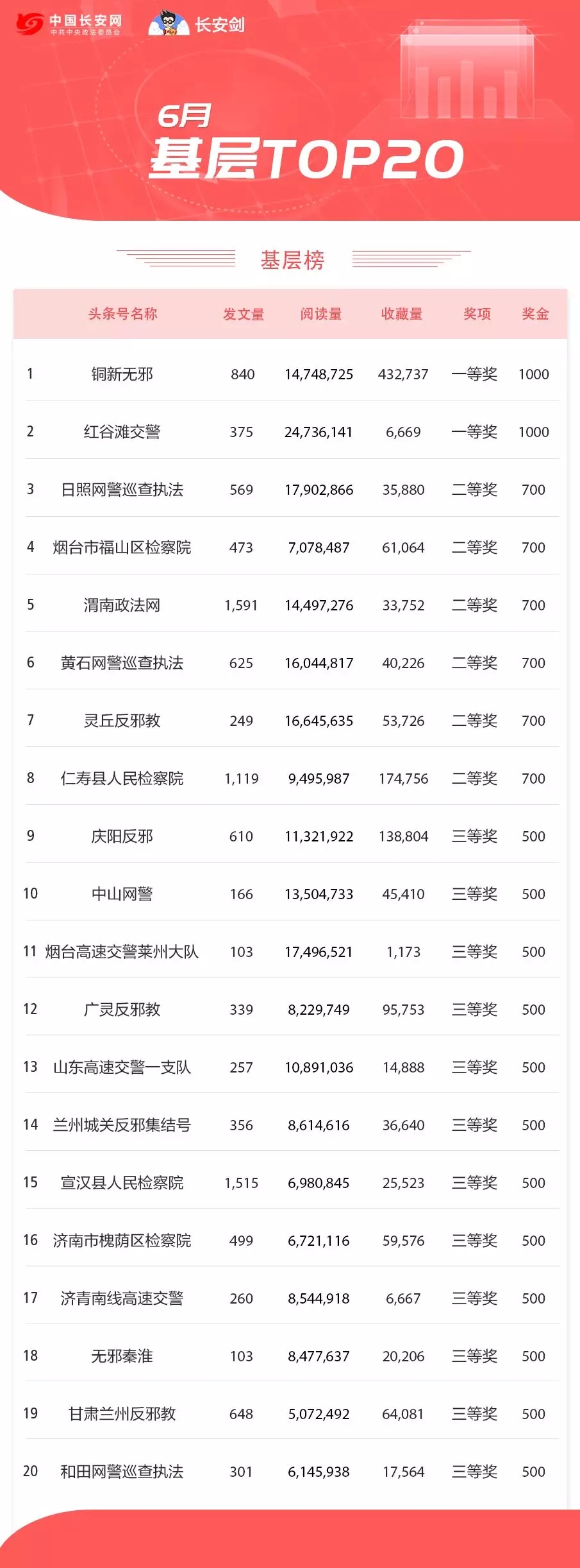 中央政法委官方新闻网站中国长安网、长安剑联合今日头条,独家发布本月政法头条号排行榜。