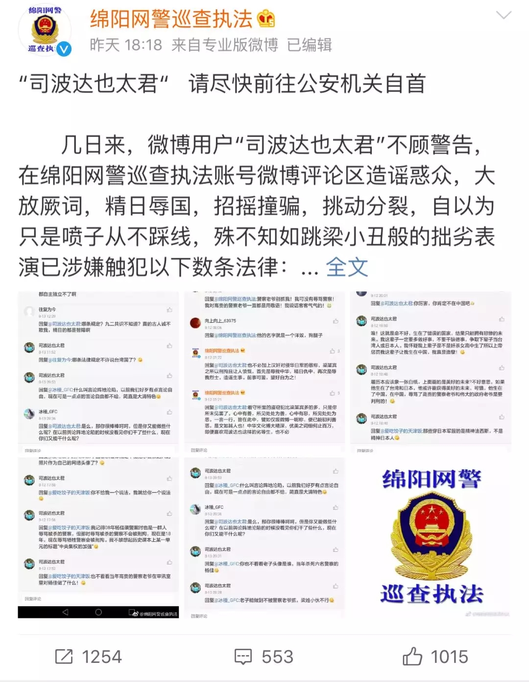 昨天(14日)下午,四川绵阳市公安局网络安全保卫支队 在官方微博“@绵阳网警巡查执法” 通知微博用户“司波达也太君”:请立即删除所有不当言论,并前往公安机关自首,否则等待你的将是法律的严惩!