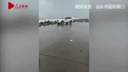 广东汕头,东海岸边竟然有人专门开车带着家人到海边看台风,白色SUV在惊涛骇浪中飘摇。