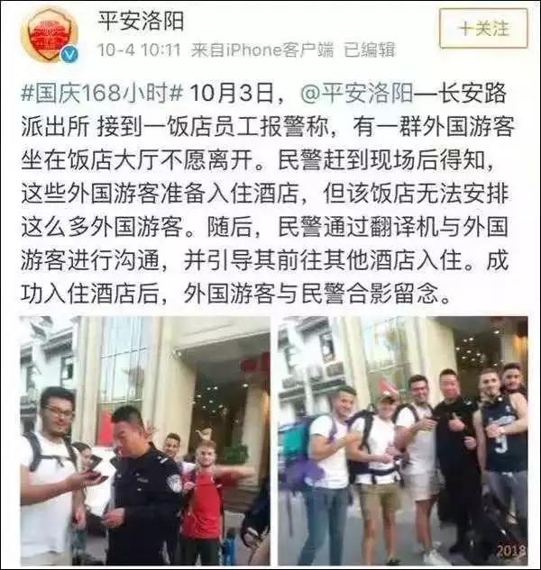 十一黄金周许多外国友人纷纷来到中国旅游但因为语言不通等问题他们的旅途中也时不时会遇上各种困扰洛阳长安路派出所接到一饭店员工报警称有一群外国游客坐在饭店大厅中不愿离开民警赶到现场后得知这些外国游客准备入住酒店可是酒店没有足够房间安排于是民警拿出翻译机与他们沟通并引导前往其他酒店