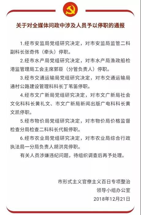 第二天,仙桃市通报,以上6家单位7人被停职: