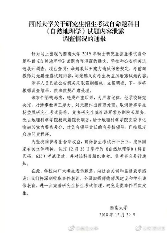 3、西南大学通报考研泄题事件:命题老师违规泄露,研究生院常务副院长等被免 针对网上出现的西南大学考题泄漏事件,经学校和公安机关调查,考前命题教师王建力违反保密规定泄漏试题内容。(@人民网)