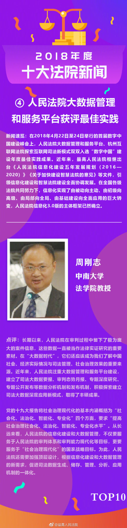 中国长安网1月8日电(记者 黄海英)由人民法院报评选出的2018年度人民法院十大法院新闻日前发布。此次评选着眼于新闻背后的重大社会意义和法治价值,力求通过新闻的视角立体化展示过去一年里人民法院致力于司法改革和法治进步的生动实践和喜人成效。